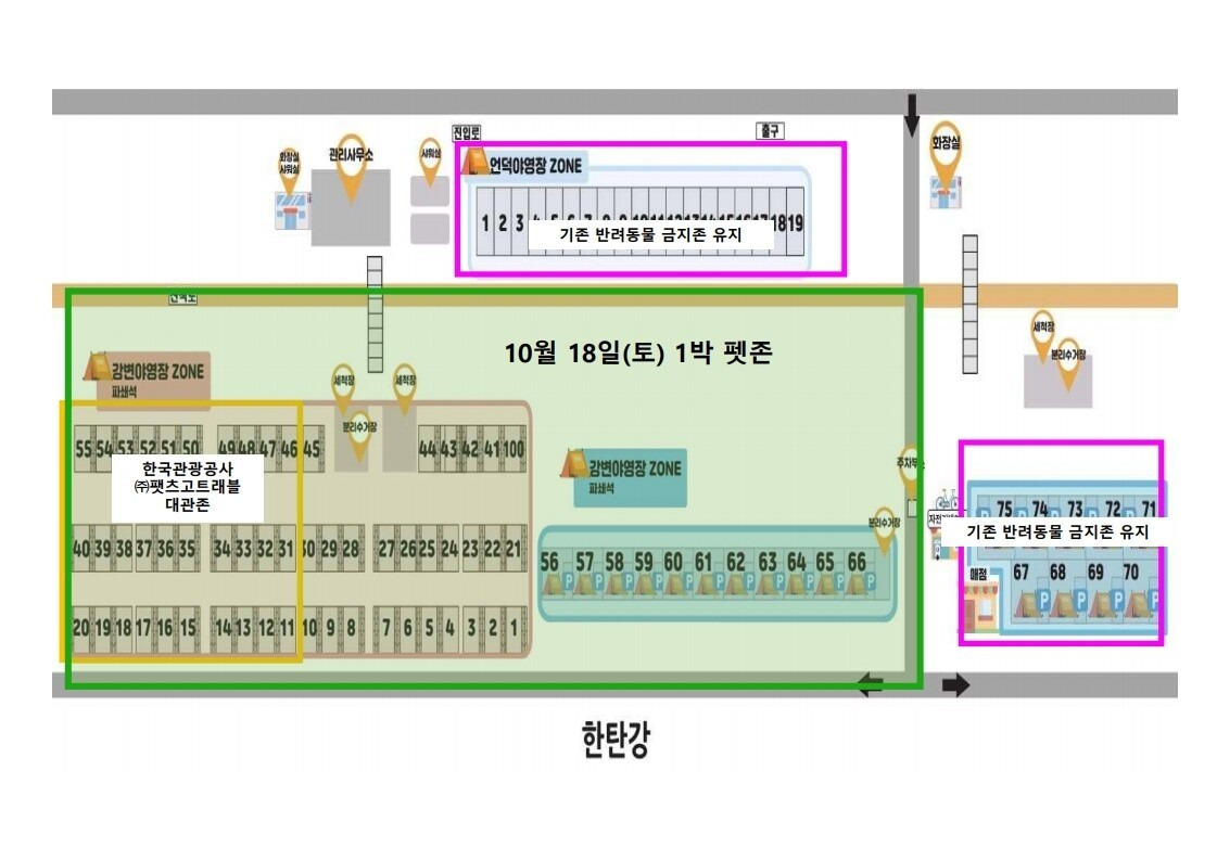 이번에 운영되는 펫존은 한탄강관광지 강변야영장 중 일부(1-65번, 100번 사이트)만 해당하며, 반려동물을 동반하는 이용객만 예약을 할 수 있다.