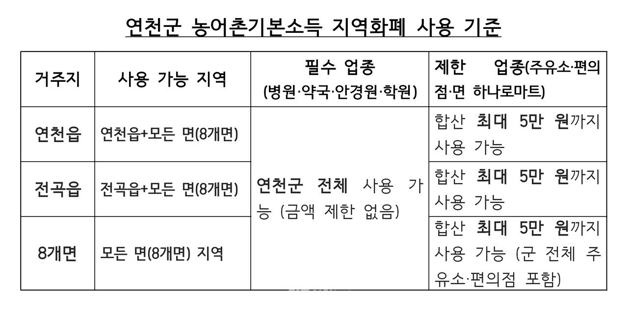 연천군은 주민등록 주소지에 따라 3개 권역으로 나뉜다. ▲1권역(연천읍) 주민은 연천읍과 8개 면에서 사용할 수 있으나 전곡읍에서는 사용이 불가하다. ▲2권역(전곡읍) 주민은 전곡읍과 8개 면에서 사용 가능하며 연천읍에서는 쓸 수 없다. ▲3권역(8개 면) 주민은 8개 면 지역에서만 사용 가능하며 연천읍과 전곡읍에서는 사용이 제한된다. 다만 병원, 약국, 학원, 안경점 등 4개 업종은 권역과 상관없이 연천군 전역에서 결제할 수 있다.